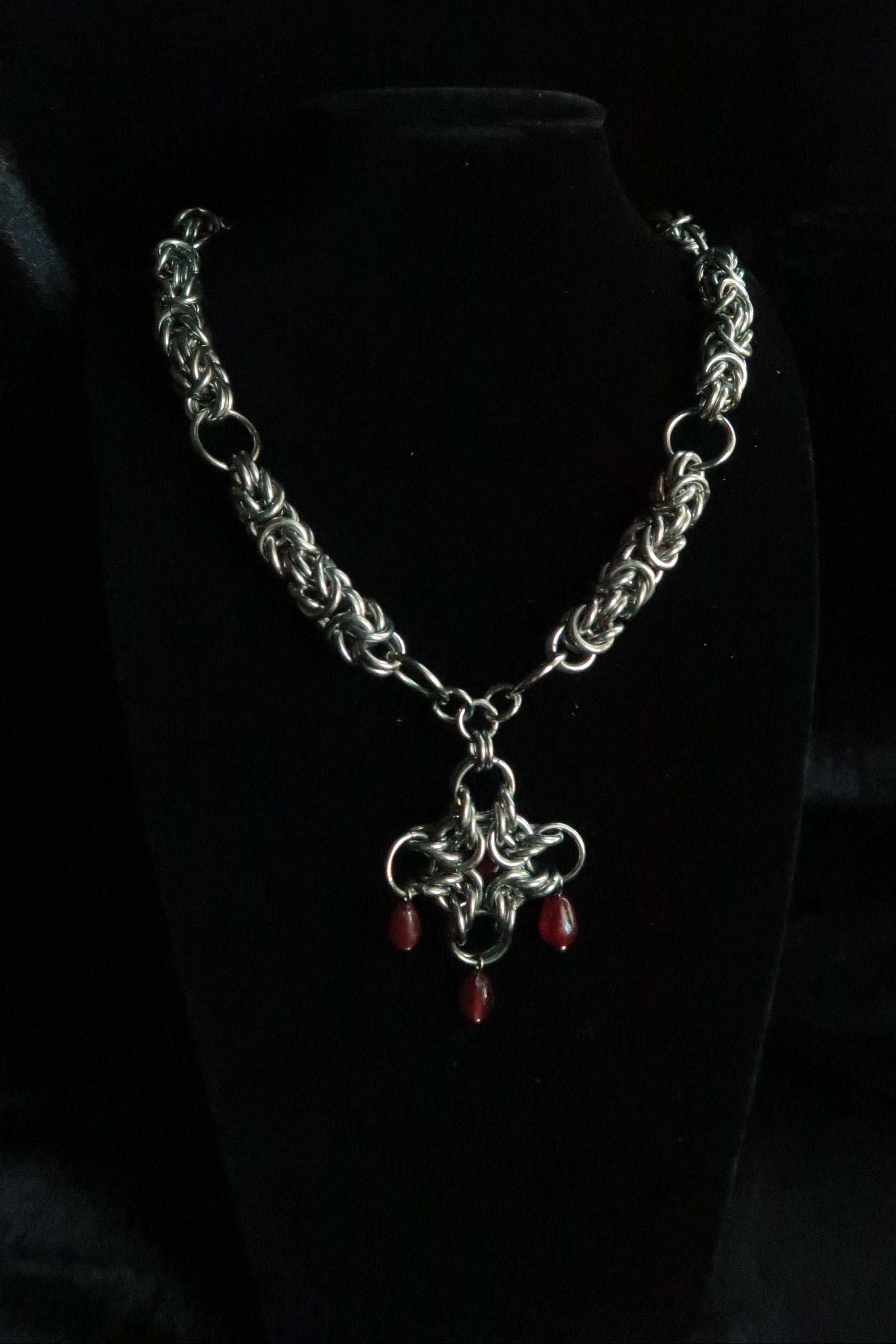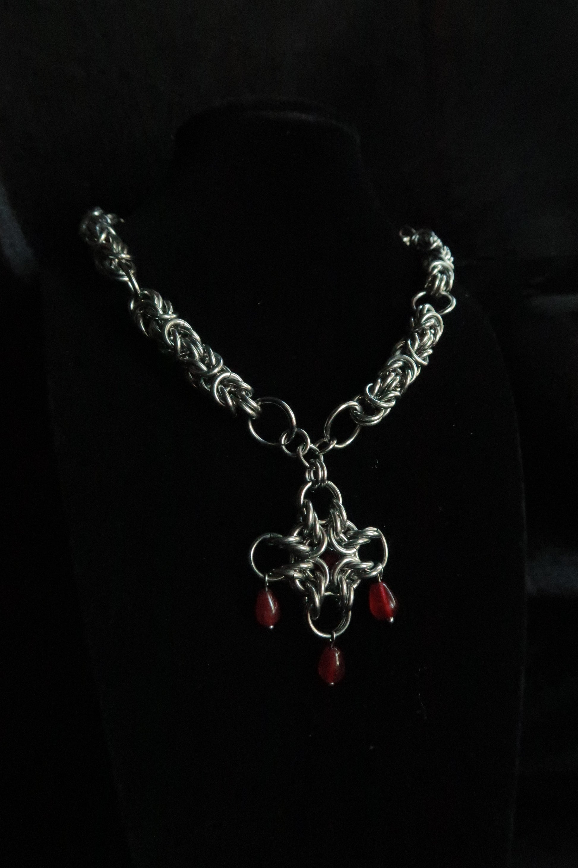 Our Carmilla Necklace is inspired by the dark opulence of gothic vampiric literature. Beading inspired by blood droplets, linkwork designed to portray both elegance and stoic power...