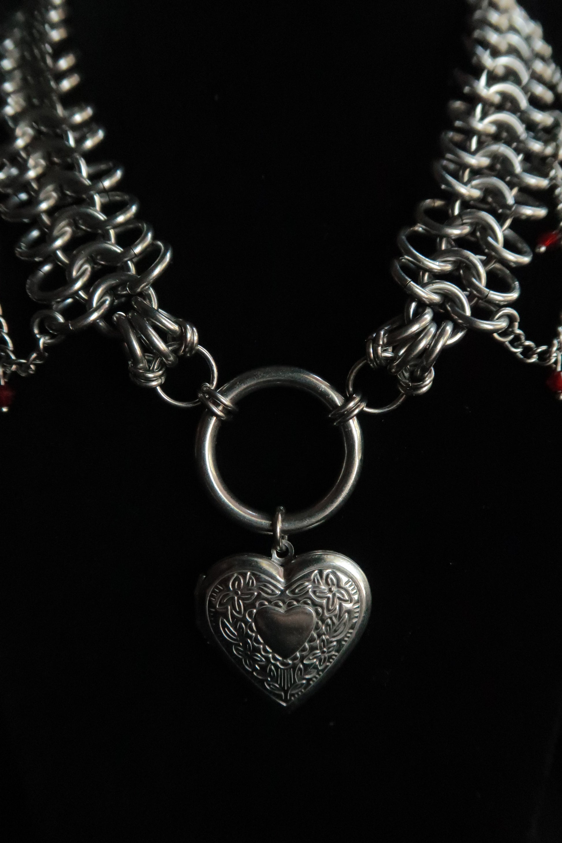 The Helena necklace features a traditional European 4-in-1 weave as the base chain with delicate, smaller chain draping and a focal point of a heart pendant. A combination of traditional maille elements with the softness and elegance of an engraved locket.