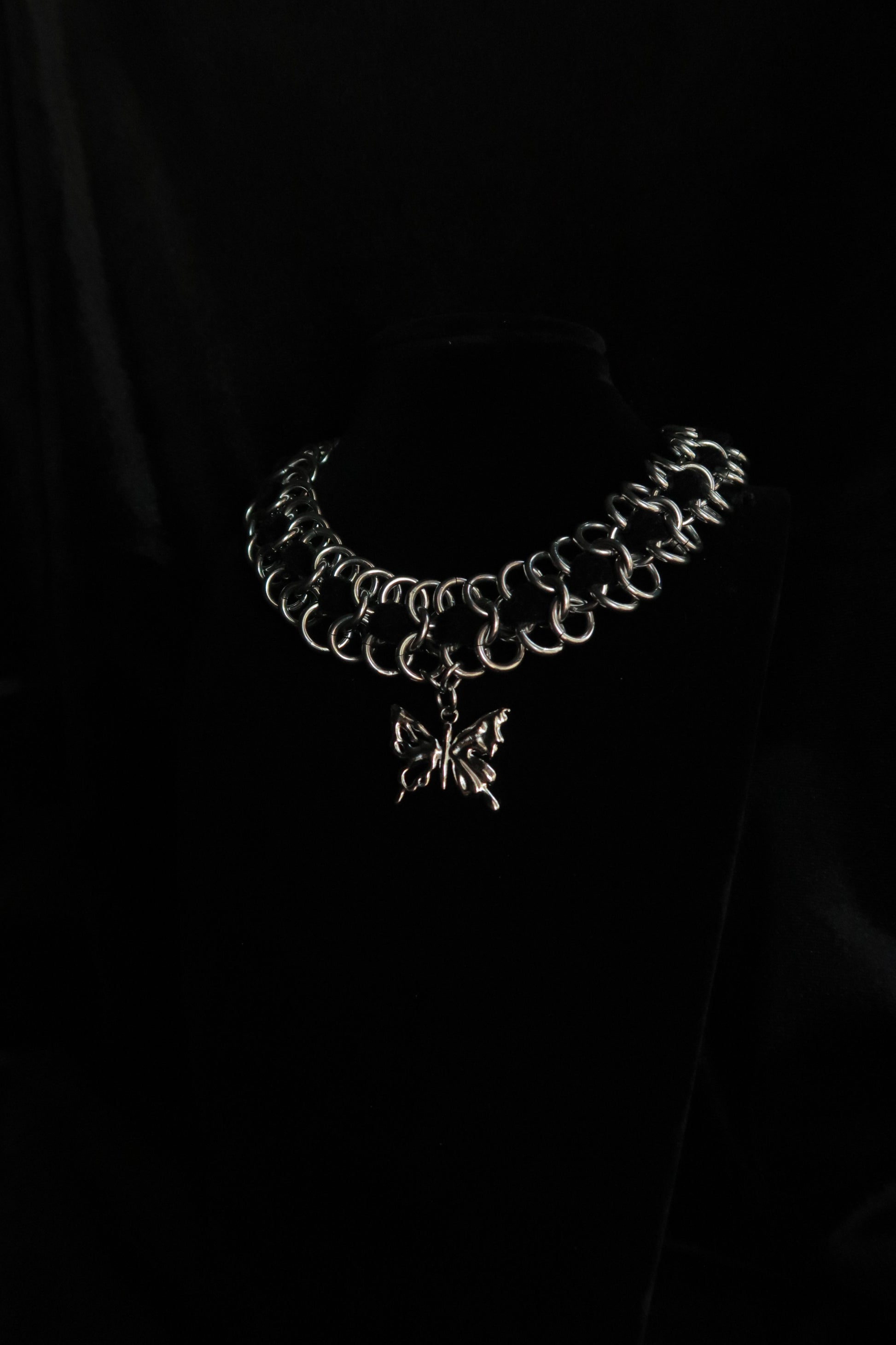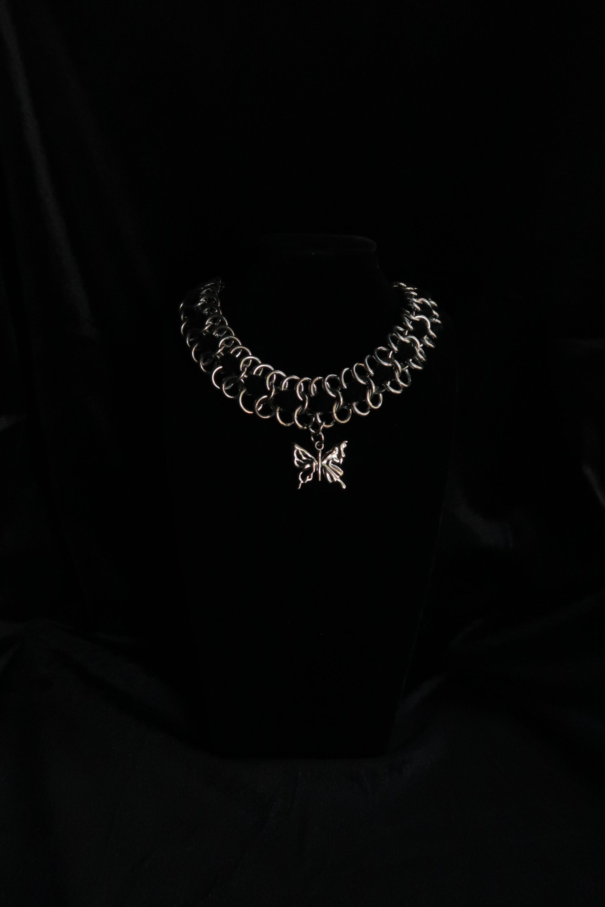 Our Lily Choker is made from thick gauged stainless steel rings with a pitch black velvet ribbon laced through throughout and a butterfly pendant adorned in the center. Delicate yet severe.